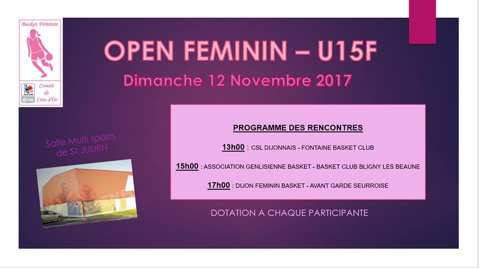 La première journée du championnat départemental de Côte d'Or débutera par un OPEN FEMININ U15 à la salle multi Sports de St Julien le dimanche 12 Novembre 2017.