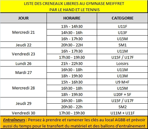 Le gymnase Patouillet étant fermé pour cause de travaux dans la salle durant l'intégralité des vacances scolaires, nous avons établi un calendrier de substitution dans le gymnase Meiffret grâce à l'aimable collaboration du hand et du tennis. Grand merci à eux !!!